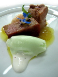 - Llom de tonyina fumat amb compota de llima, litxis, gelat de wasabe i borratja