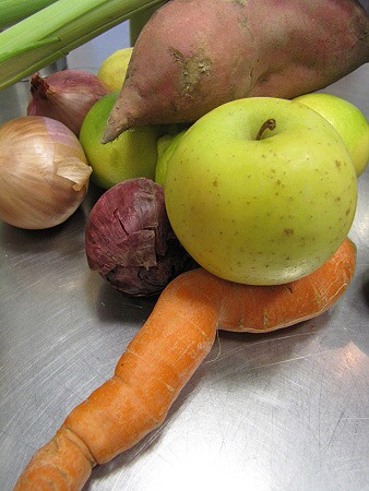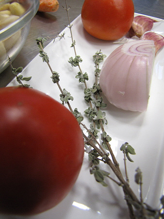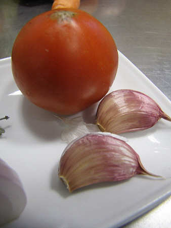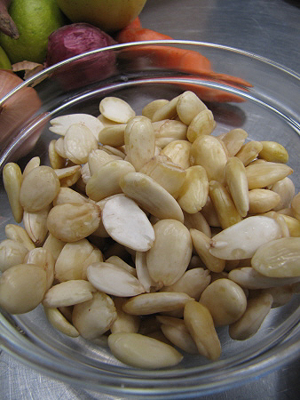 Pelar i picar les ametlles. Picar ben petit la ceba, la pastanaga, i els gans d'all. Trirar el tomàquet pelat i sense llavors.