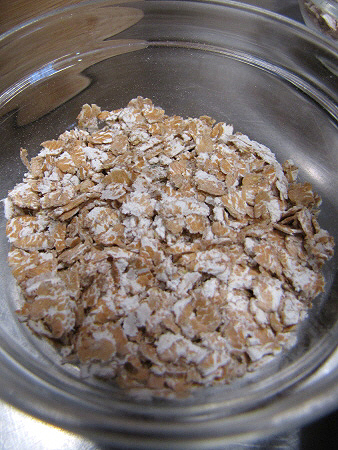 Posar en un plat fondo els flocs, la poma ratllada, les panses i el suc de mandarina.