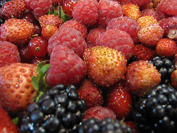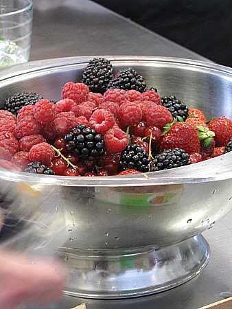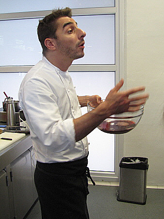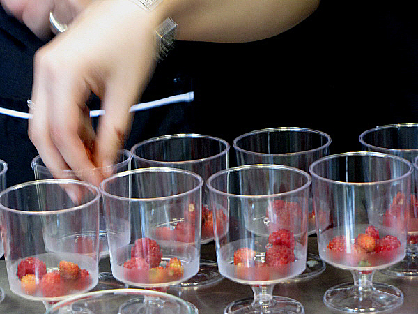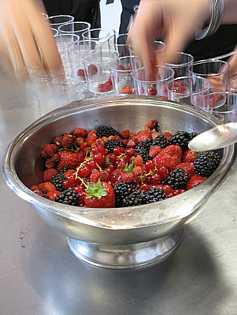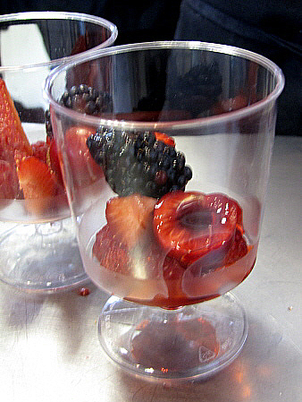 Infusió freda de maduixots amb fruits vermells, granisat de sangria i mousse de recuit d'ovella