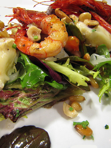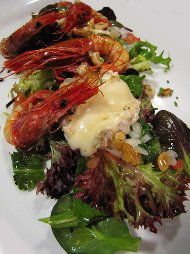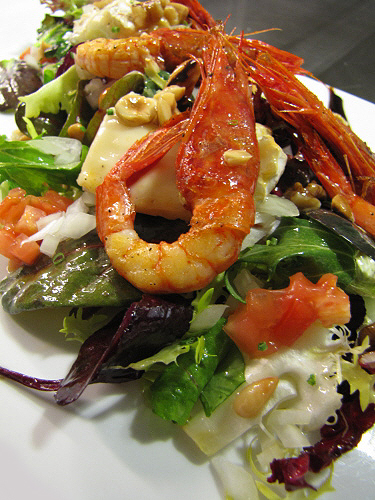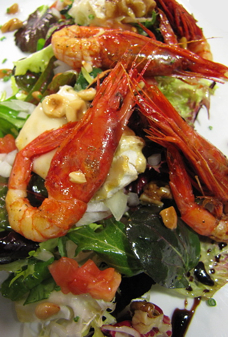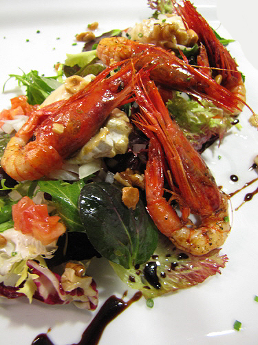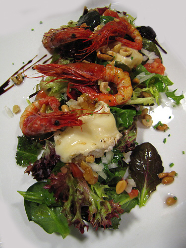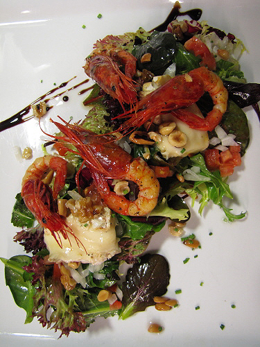 Amanida de gambes de Blanes, formatge Tou dels Tillers i vinagreta de raïm, mel i mostassa (Clicar damunt les imatges per ampliar-les) --- --- ---