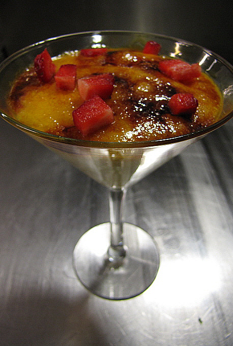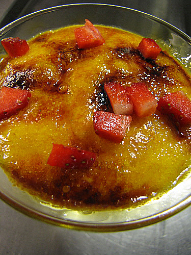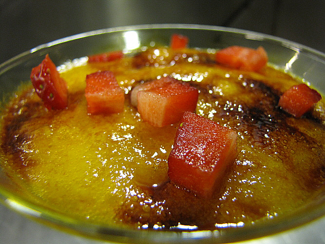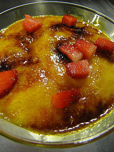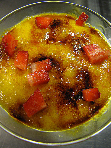Núvol de crema catalana de mango cremada i daus de maduixa |