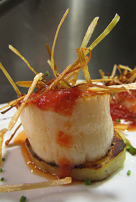 Vieires amb patata confitada, tomàquet dolç i cruixents de porro |