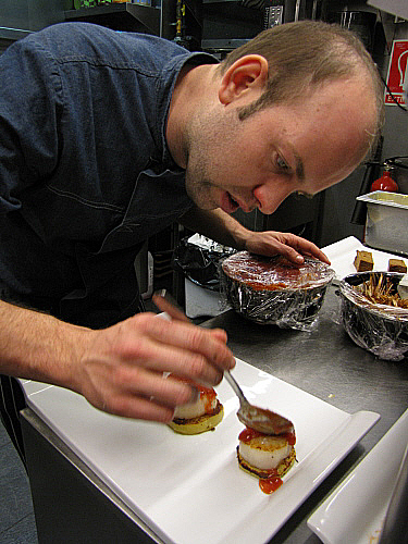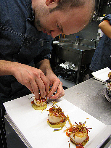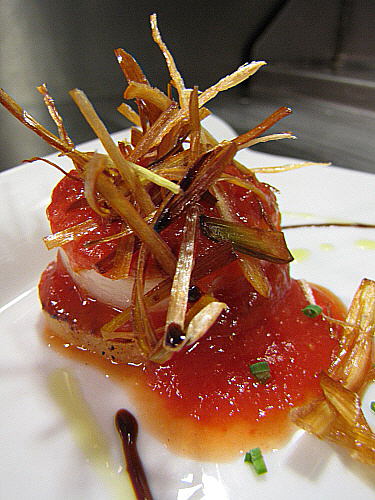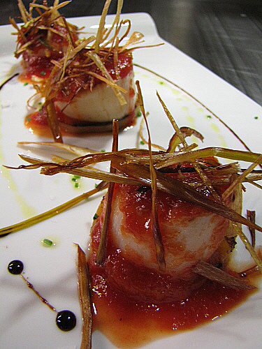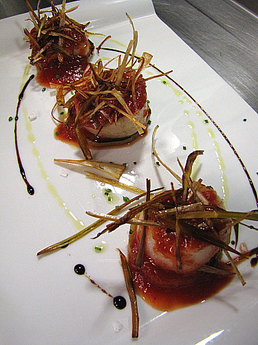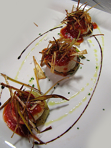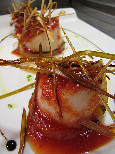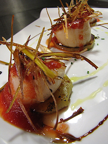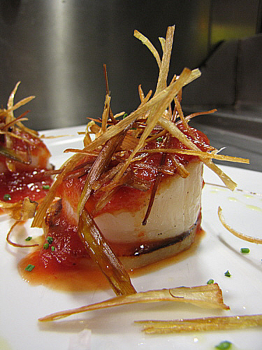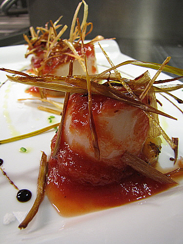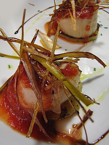 ![]() Vieires amb patata confitada, tomàquet dolç i cruixents de porro |