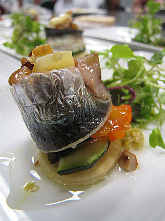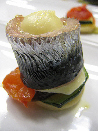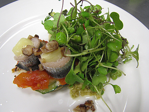 Amanida tèbia de sardines farcides de formatge sobre una coca mediterrània