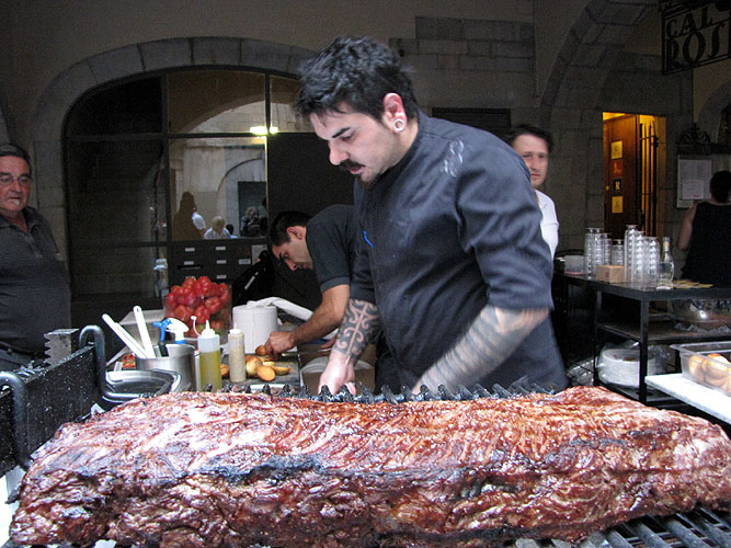 (Ampliar) - 5a. Jornada de Cuina al carrer Cort Reial i rodalia.A part de la cuina catalana, representada amb grambes a la plaxa, arrossos o amb el tradicional pa amb tomàquet, la jornada gastronòmica va presentar una aposta culinària que abastava des de propostes de cuina de l'Índia fins als nachos mexicans o les empanades argentines, tastets que foren amenitzats per la música en directe, de diversos estils, a la plaça de l'Oli i a la pujada de l'església de Sant Feliu.
