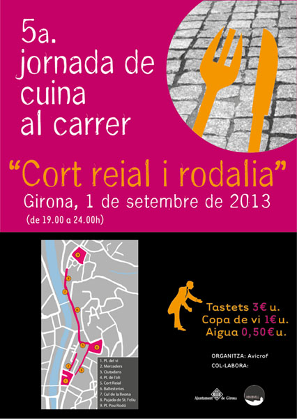 ![]() El diumenge 1 de setembre 2013 s'ha celebrat als carrers del Barri Vell de Girona la cinquena edició de la Jornada de Cuina al carrer "Cort Reial i rodalia", edició en la que s'ha ampliat, a més de l'habitual entorn de la Cort Reial, als carrers Ciutadans, Mercaders i al voltant de les places Sant Fèlix i Pou Rodó. A partir de les set de la tarda i fins a les dotze de la nit, multitud de taules improvisades als carrers i places es van posar a disposició d'uns assistents satisfets amb la iniciativa, en la que es van servir 18.000 tapes.