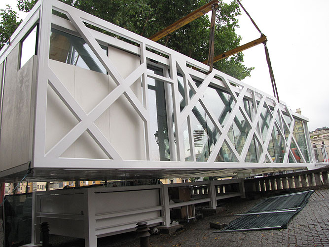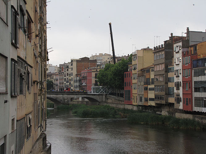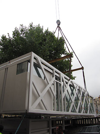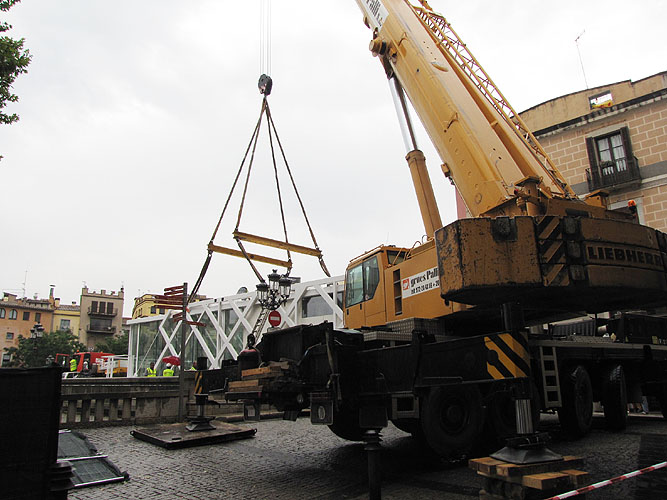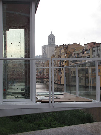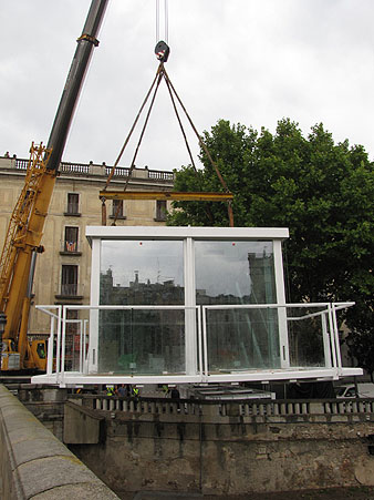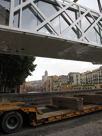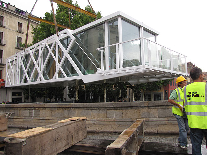 (Ampliar) - Muntatge del Vol des del pont de les Peixateries Velles.El Vol Espai Gastronòmic pesa 28 tones i fa 20 metres de llarg, dels quals dotze estan fixats damunt d'una estructura al carrer Santa Clara i els vuit restants queden suspesos damunt el riu Onyar. Amb aquestes dimensions ha sigut necessària una operació complexa i al mil·límetre per tal de passar l'estructura rectangular fins al seu emplaçament.