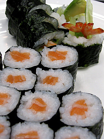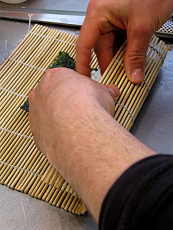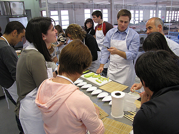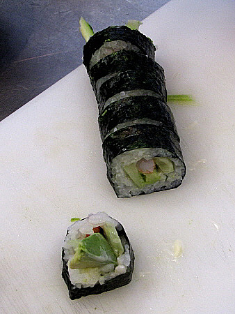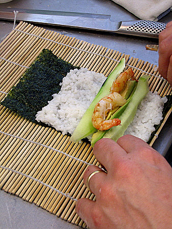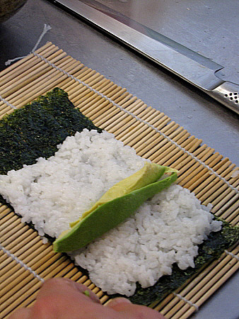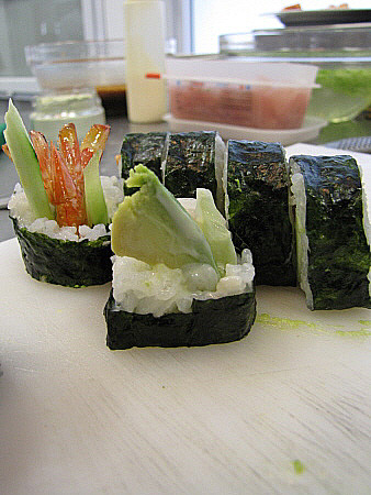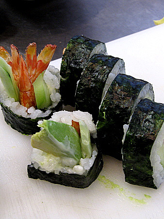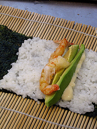 Preparació dels rotlles de llagostí i alvocat, i muntatge dels plats