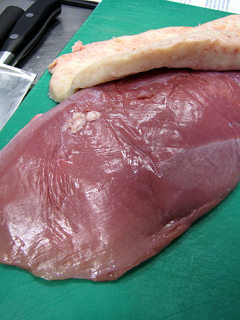 Retirar la pell greixosa del magret d'ànec i picar la carn amb un ganivet ben esmolat.