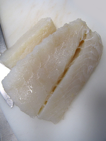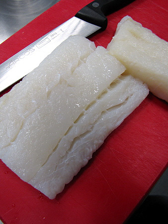 Retirar la pell del llom del bacallà i picar-lo amb un ganivet ben esmolat.