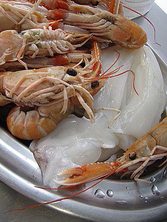 Per altra banda, netegem la sèpia, la tallem en tires i la congelem. Pelem els escamarlans i els reservem.