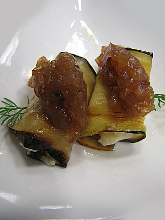 Peleu i talleu el formatge a llesques una mica gruixudes. Emboliqueu les llesques de formatge amb les làmines d'albergínia. Gratineu lleugerament els farcells, i serviu-los amb la confitura.