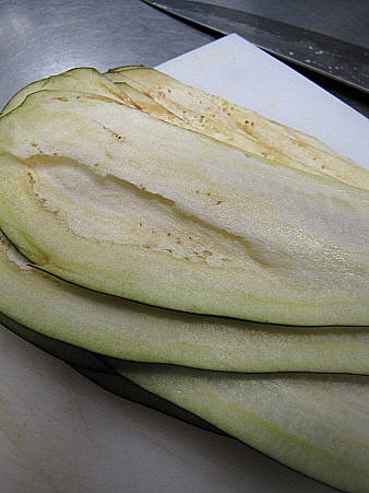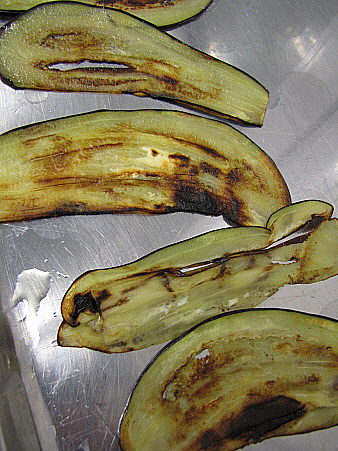 Talleu la meitat de l'albergínia a làmines molt fines, i marqueu-les a la planxa o paella.