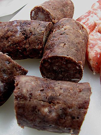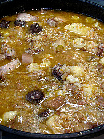 Afegir l'arròs, salpebrar i mullar amb el brou ben calent. Saltejar a part la botifarra negra sense pell tallada a rodanxes i la cansalada fresca prèviament cuita i incorporar-la a mitja cocció de l'arròs. Completar-ne la cocció al forn.