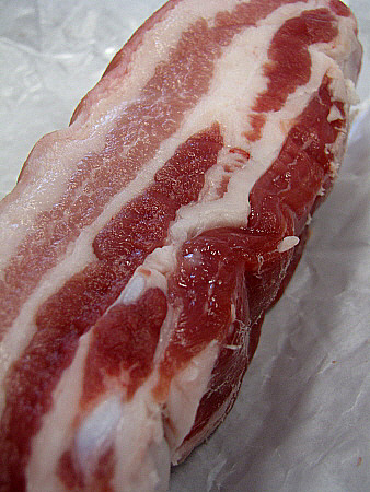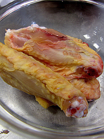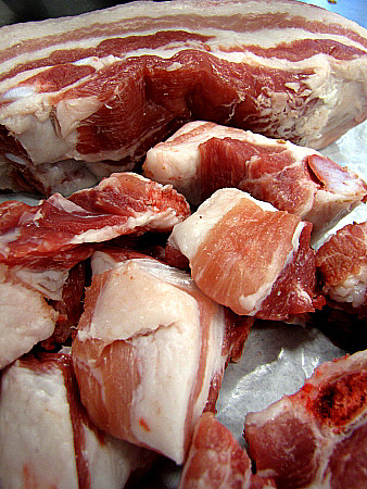 Saltejar les carcasses de pollastre amb oli verge junt amb la ceba fins a daurar. Retirar el greix i mullar amb aigua fins a cobrir. Portar a ebullició i coure a foc mitjà durant 35 minuts. Colar i coure la ventresca fresca dins d'aquest brou fins a completar la cocció. Retirar i reservar per separat el brou i la carn de porc.