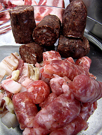Refugar en una cassola amb oli verge el costelló de porc junt amb les saltsitxes, les ales de pollastre i la cansalada salada. Retirar i dins el mateix oli coure la ceba lentament fins a daurar, incorporar els alls i un cop cuits, la polpa del tomàquet fins a obtenir un sofregit ben concentrat.