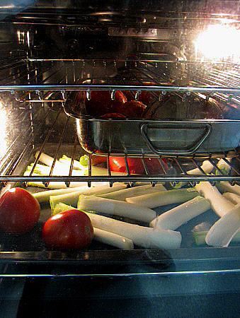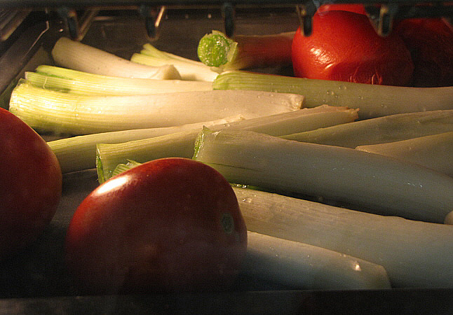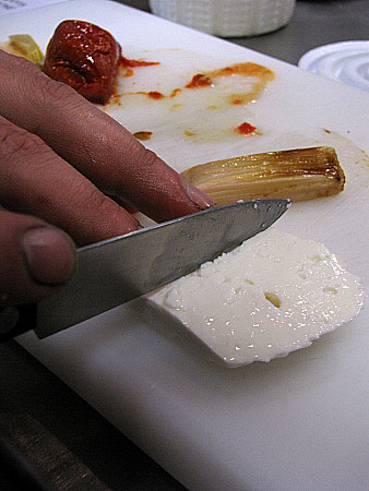 Filets de verats amb calçots, tomàquets escalivats i formatge fresc