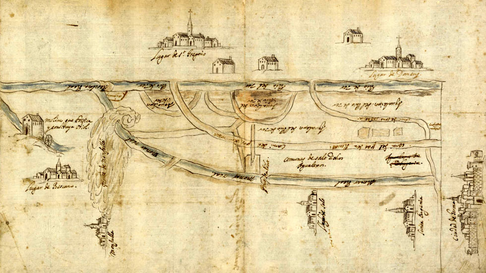 El primer esment documentat de la vila de Bescanó és del 1058, data en què la comtessa Ermessenda restituí l’església al bisbe Berenguer de Girona. Els nuclis de Montfullà i Estanyol apareixen esmentats en pergamins de l’any 882 quan el bisbe Teuter donà diversos delmes de l'església de Sant Pere a la Seu de Girona ("Basilicam Sancti Petri in monte foliano"). El 1058 la comtessa Ermessenda de Carcassona la restitueix al bisbe Berenguer. També és citada en l'homenatge prestat per Guillem Castell a favor de Pere de Carcassona, bisbe de Girona. Mapa manuscrit dels aiguadeixos del Ter entre Bescanó, Sant Gregori i Girona. 1750. Institut Cartogràfic i Geològic de Catalunya - (Ampliar)