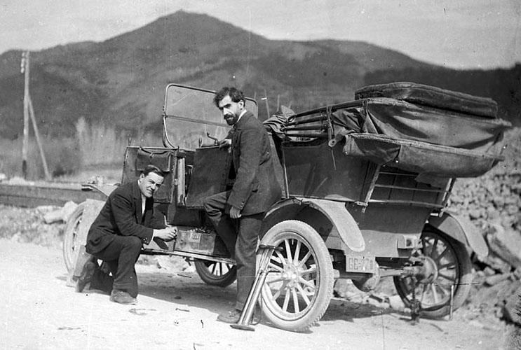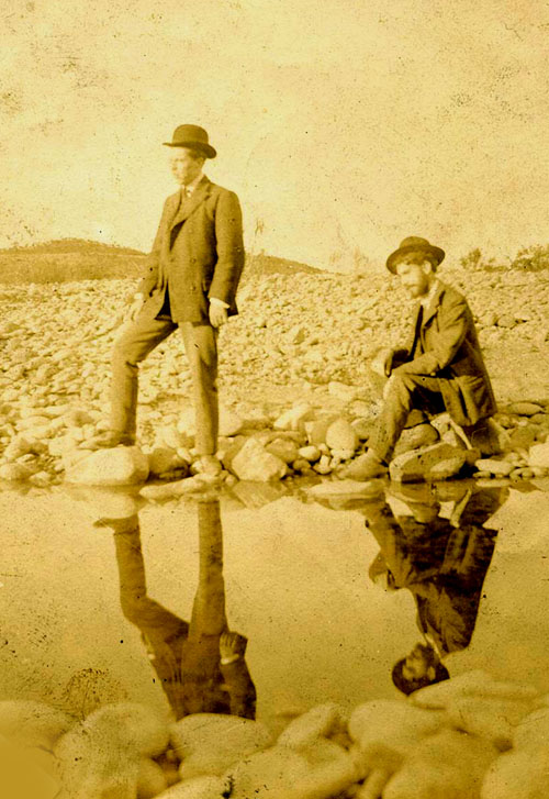 Miquel de Palol Felip amb Ramon de Berenguer, propietari de la Central elèctrica de Bescanó, a la riba del Ter al seu pas per la central. 1912-1939. Autor desconegut. CRDI - Ajuntament de Girona - (Ampliar)