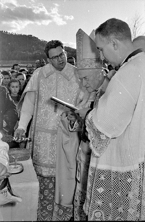 Col·locació de la primera pedra de l'església de l'Assumpta. Missa de campanya oficiada pel bisbe de Girona, Josep Cartañà Inglès. 1959. Miquel Morillo Gallego. CRDI - Ajuntament de Girona - (Ampliar)