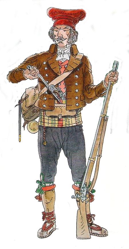 Guerres carlines. Capità d'infanteria del 4t batalló de la Dibisió de Girona. Dibuix de Francesc Riart - (Ampliar)