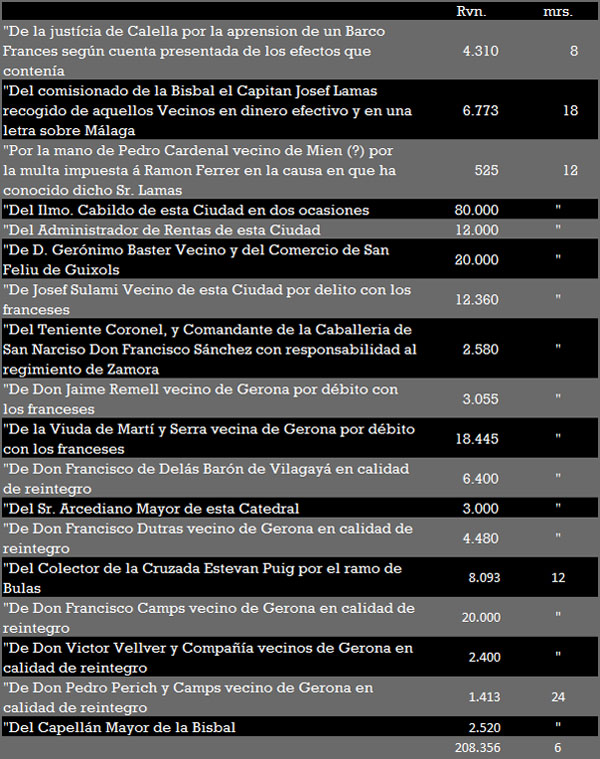 El Marqués de Lazán cuya estancia en este país, ningun fruto, militarmente hablando, había producido, fue una calamidad para la hacienda de la junta de Gerona, pués al marcharse hacia Vich á ultimos de Enero, se llevó cuantos caudales pudo de la misma, inclusa la mayor parte de los que tenía en varios pueblos, dejando así esquilmados á los corregimientos de Gerona y Figueras. Este despojo hubo de ser causa de acerbas censuras, y sin duda para ver de acallarlas se publicó el siguiente: "Suplemento al Diario de Gerona del viernes 27 de Enero de 1809. "El Excmo. Sr. Marqués de Lazán ha mandado se de al Publico una nota de los caudales que el Ministro Real de la Hacienda de la Division de su mando ha percibido de varios particulares de esta ciudad y Corregimiento, para satisfaccion de los interesados, y de su Excelencia, y es la siguiente: "Nota de los caudales que el Ministro Real de Hacienda de la Division del exército de Aragon ha recibido de varios particulares de la ciudad y corregimiento de Gerona para socorro de la tropa de dicha Division, en virtud de las ordenanzas expedidas por su General el Excmo. Sr. Marqués de Lazán: á saber