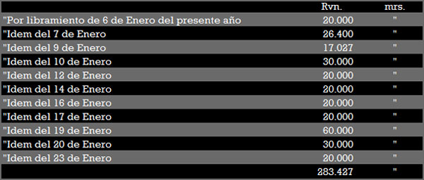 "Nota. A mas de esto ha recibido dicho señor Ministro trece Vales Reales, á saber seis de 150 Pesos, uno de 300 de Pedro Perich y Camps, quatro de 300 pesos de Manuela Valari, y dos de 150 de Jerman Llandrich.-- Josef Maria de Lasuén. "Asi mismo ha mandado S.E. se publique otra nota de lo que dicho señor Ministro ha percibido de la M.I. Junta de esta Ciudad, y distribucion de ello; á saber: