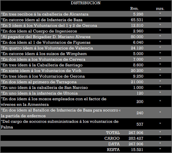 "Por la manera que del caudal recibido hasta el día de la fecha por libramientos expedidos por la muy Ilustre Junta de Gerona, y de distribucion á los Cuerpos independientes de la Division de Aragon resulta contra dicho Señor Ministro la cantidad de 15.521 reales vellon. Gerona 24 Enero de 1809.-- Josef Maria de Lasuén". Emilio Grahit y Papéll Bibliografia. Extret de "Reseña histórica de los Sitios de Gerona en 1808 y 1809". Emilio Grahit y Papéll, Imprenta y libreria de Paciano Torres, Gerona. 1894. |