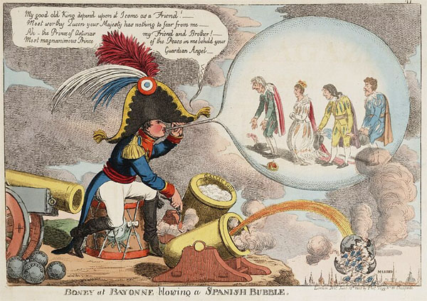Es curiosa sin embargo la manera como los franceses han querido disculpar ó tan siquiera esplicar su primera derrota bajo los muros de Gerona, en lo cual han tenido mucho empeño para oscurecer la humillación que sintieron al verse batidos por paisanos sin organización y por un número tan reducido de militares. Lafaille jefe de ingenieros franceses, en sus Memoires sur les campagnes de Catalogne, de 1808 á 1814, echa la culpa de la derrota á la lijereza de Duhesme, mientras éste á su vez se la echa á él, por no haber tenido preparados ninguno de los materiales necesarios para el asalto y demás ataques emprendidos. Además, queriendo ridículamente despreciar la victoria de los gerundenses, ha amalgamado los sucesos para hacer, como hacen muchos autores de memorias militares, una defensa y ensalzamiento de los hechos propios, no olvidándose por consecuencia Lafaille, á quien entonces nadie tenía en la menor importancia, de esplicar que él fue el valiente, el previsor y el entendido. Este recurso cómodo, pero sobradamente gastado, no hace efecto, como no sea la sonrisa de desprecio que mueve al lector desapasionado. Con el mayor aplomo de este mundo nos participa Lafaille que con el asalto se asustaron tanto los gerundenses, que dejaron salir al segundo parlamentario y mandaron dos por su parte á Duhesme, á quien dice que contaron que todo el mundo quería rendirse menos el populacho, de modo que el volver á la ciudad les daba tanto cuidado, que llegaban á temer por su vida, y con este temor pidieron se les dejase pasar allí la noche, lo que se les concedió generosamente, y además se les concedió también, al amanecer del siguiente día, su regreso (¡aquél regreso que debía costarles la vida!), con la condición de volver á las 7 con una respuesta definitiva. Añade, con igual serenidad el autor citado, que se esperó á dichos diputados hasta las 10, y viendo que no volvían a pesar de sus generosidades, emprendió Duhesme la retirada, habiéndose después averiguado que la tardanza era debida á que se estaban estendiendo los artículos de la capitulación. Al ver que el enemigo se alejaba, la junta militar comprendió que no tardaría en volver por la revancha, y considerando que la plaza no estaba en disposición de sufrir ni ocho días de sitio formal, tomó las más activas providencias para ponerla en estado de defensa. El comandante de ingenieros D. Guillermo Minali se dedicó desde luego á los trabajos necesarios para ensanchar, profundizar y llenar de agua los fosos y cortar los árboles de los alrededores, a pesar de que formaban hermosos paseos, como también devastar márgenes, cercas, vallados y demás obstáculos que podían ofender y protejer los aproches del enemigo. El comandante de artillería D. Pablo Miranda estableció una completa maestranza, parque de artillería y laboratorio de fuegos artificiales; y corrijiendo los demás puntos de su ramo, consiguió poner en breve tiempo coronada la muralla con la suficiente artillería, habiéndose tenido que construir y aprontar para ello en pocos días más de 50 cureñas. Fué muy celebrada la actividad de ambos jefes, que realizaron dichos trabajos a pesar de no contar con el auxilio de oficiales de sus armas. Fué una gran suerte para Gerona que el enemigo hubiese dejado intactos dos grandes almacenes existentes en las afueras, uno el de la pólvora detrás del fuerte Condestable, con una gran cantidad de barriles de dicha materia y otro en el llano, junto á la cruz de camino de Barcelona, lleno de maderas de construcción, valoradas en más de un millón. Así es que apenas se perdió de vista el enemigo, se mandaron introducir en la plaza unos y otros efectos, prestándose para ello con el mayor entusiasmo la mayor parte de los carruages y acémilas de los habitantes, incluso los coches de las señoras y personas de posición. El día 22 D. Benito Rovira que por comisión de la junta había pasado á Mallorca, volvió llevando 200.000 cartuchos de fusil, manifestando las dificultades que ponía el capitán general de aquellas islas en facilitar los demás auxilios que se le pedían de gente y armas y concediendo solo permiso para venir al teniente coronel y sargento mayor de ingenieros D. José Torres y Pellicer, á fin de coadyuvar á la defensa de la plaza. Causó esta última notícia mucha alegría entre los vocales de la junta, de quienes era Torres muy conocido, de modo que hasta se hizo pública la notícia para satisfacción del pueblo. El señor Torres y Pellicer llegó al siguiente día entrando á formar parte de la junta militar. Como los enemigos se mantenían en las poblaciones de la costa y realizaban algunas correrías, se temió por la suerte del castillo de Hostalrich, cuya pérdida podía ser de fatales consecuencias. Para evitarlo se dispuso que el día 24 saliesen el señor Torres y Pellicer, el capitán de Ultonia D. Daniel O-Suliván, gobernador interino de aquella plaza nombrado por la junta, los oficiales del mismo cuerpo D. Manuel Motes y D. Pedro Sprackman, el subteniente de artillería D. Narciso Serrats y diez artilleros de marina de la villa de S. Feliu de Guixols. Llegados á Hostalrich pusieron el castillo en estado de defensa y lo proveyeron con gente, municiones y víveres, regresando á Gerona dicho jefe de ingenieros. El día 28 se presentó ante la junta de Gerona el teniente coronel don Francisco Miláns, fugado de Barcelona, ofreciendo derramar su sangre en defensa de la independencia patria. Expuso la conveniencia de formar un cordón cerca de Tordera para observar y detener al enemigo por cualquier carretera que viniese. La junta aceptó la idea y considerando á dicho jefe como muy práctico del terreno y hombre de valor y pericia en la guerra de guerrillas, le confió el mando del espresado cordón. Caricatura de l'abdicació de Baiona. 1808. Library of Congress, Washington DC.