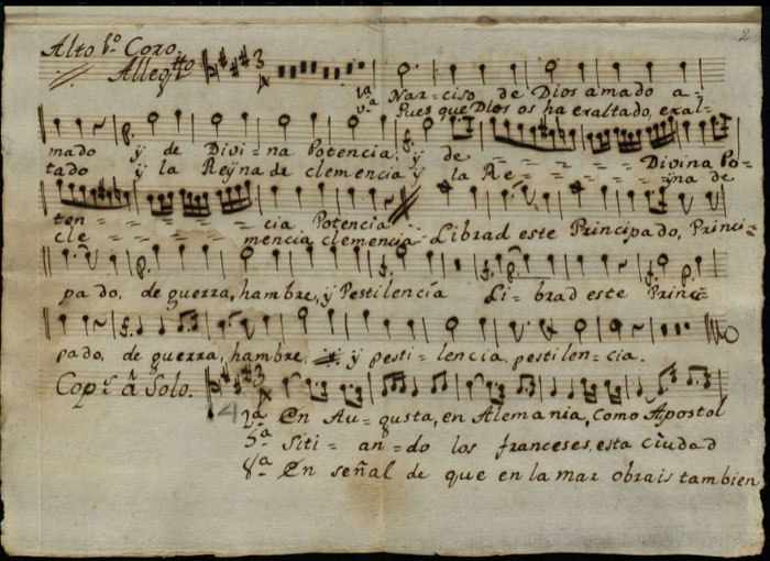 "D. Fernando Septimo por la Gracia de Dios Rey de las Españas y sus Indias y en su Real nombre la Ciudad de Gerona, representada por la Muy Ilustre Junta General compuesta de la Gubernativa, Militar y Económica del Muy Ilustre y Pleno Ayuntamiento, de los comisionados del Muy Ilustre Cabildo de la Santa Iglesia, de los muy Reverandos Prelados de las Religiones y otras distinguidas personas de la Ciudad, convocadas en la Sala capitular de la Casa Consistorial á la hora que serían las seis de la tarde del día primero de julio del año de mil ochocientos y ocho, en la que fueron presentes el Coronel D. Julian de Bolibar Theniente de Rey de esta Plaza haciendo veces de Gobernador Interino de la misma, presidente de la Junta; el Iltre. Sr. D. Joseph Perez de Tobias Sacristan maior Dignidad y Canónigo de dicha Santa Iglesia, Vicario General y Governador de este Obispado por hallarse ausente de esta Ciudad el Ilmo. Sr. D. Juan Agapito Ramirez de Arellano Obispo de la misma; El Ilmo. Sr. D. Narciso Coll Arzobispo electo de Caracas; el Iltre. Sr. D. Luis María Martínez Abad de la Colegiata Iglesia de San Feliu de esta misma Ciudad; D. Juan Planella y D. Julián Cufi Canónigos de la Santa Iglesia; el Dr. D. Joaquín Llauder monje camarero del Real Monasterio de San Pedro de Galligans; el Dr. Fr. Juan Costavella Prior del Convento de Santo Domingo orden de predicadores; el P. Fr. Antonio Valaguer Lector de Prima y Guardián del Convento del Seráfico Padre y Patriarca San Francisco de Asis; el P. Fr. Jaime Font superior del Convento de Carmelitas calzados; el P. Presentado Fr. Pablo Virallonga Comendador del convento de Nuestra Señora de las Mercedes; el P. Maestro Fr. Calixto Vear prior del Convento de S. Agustin; el P. Fr. Cherubin de Granollers, Guardián del Convento de PP. Capuchinos; el P. Fr. Juan de los Dolores Prior del Convento de carmelitas descalzos; el P. Fr. Antonio Carbonell Corrector del Convento de S. Francisco de Paula; D. Antonio O-kelli Coronel del Regimiento Infanteria de Ultonia; el Theniente Coronel D. Juan Molinas Sargento mayor del estado mayor de esta plaza; D. Joseph Antonio Torres y Pellicer Theniente Coronel y Sargento mayor del Real cuerpo de Ingenieros; D. Guillermo Minali Sargento mayor del dicho cuerpo de Ingenieros; D. Enrique O-Donell Sargento mayor del dicho Regimiento de Ultonia; D. Pablo Miranda Capitan del Real Cuerpo de Artillería y comandante de él en esta plaza; D. Luis de Plandolit comisario de Guerra interino de la misma; D. Francisco de Delás Barón de Vilagayá Regidor Decano del Muy Ilustre Ayuntamiento de esta Ciudad; D. Martín de Burgués Regidor perpétuo de la misma y Vocal de la Ilustre Junta Gubernativa; D. Buenaventura Quintana y D. Ignacio Gelabert Regidores perpétuos de la espresada Ciudad; D. Ramón Vilar Regidor perpétuo dela misma y vocal de la citada Junta de Gobierno, D. Joseph Sambola y D. Pio Pallés Diputados del Común, don Antonio Garrigolas Síndico Procurador General y D. Ignacio Andreu y Sans Síndico personero del Común, D. Joseph Francisco de Caramany, D. Narciso de Burgués, D. Cirilo de Rich, D. Francisco Puig y Dorca Theniente de la primera compañía del extinguido primer tercio de tropas ligeras auxiliares de Cataluña, D. Francisco Fonolleras, D. Miguel Germen, D. Tomás Sala y Cabirol, D. Joseph Jonama, D. Pío Pou, D. Narciso Diví y D. Francisco Serra, y ausentes el Coronel graduado D. Pedro O-Daly teniente Coronel del espresado Regimiento de Ultonia, que se halla enfermo de resultas de la herida que recibió en el citado dia veinte de junio, D. Joseph de la Valete, D. Ignacio Ros y D. Jaime Basart, vocales el primero de la Junta militar y los tres últimos de la Gubernativa; juntamente con D. Francisco Puig y Dorca Notario público colegiado de esta Ciudad que asistió por disposición de la misma Ilustre Junta General para levantar testimonio de lo que se tratase y de mi el infrascrito secretario del Muy Ilustre Ayuntamiento llamado para tomar las correspondientes notas y archivarlas en los libros capitulares, para que en todo tiempo conste.== Dixeron que por quanto en todos tiempos ha manifestado el glorioso invicto Patrón y Mártir San Narciso la más decidida protección a favor de este Principado de Cataluña y con particularidad de la presente Ciudad librándola de todos los peligros á que diferentes veces se ha visto expuesta, especialmente de las invasiones de los franceses en los años de 1285 y 1653, repitiendo continuos prodigios para seguridad de estos moradores: Considerando que la Victoria que consiguió esta Ciudad casi enteramente desmantelada, contra el poderoso exército francés que partió de Barcelona al mando de su Comandante en Jefe el General de División Duhesme, rechazándolo completamente en los diferentes ataques que dió en varios puntos de esta Plaza el día 20 de junio último, se debe todo á la protección de dicho Patrón y Mártir San Narciso: Que el reconocimiento y la piedad exigen un monumento espresivo y perpetuo de este beneficio y de los sentimientos de ternura y devoción que ha inspirado á todos los Gerundenses y demás que concurrieron á la vigorosa defensa de aquel día: Que en las actuales críticas circunstancias en que se halla la Patria, para defender á toda costa nuestra Santa Religión, los derechos de nuestro Soberano el señor D. Fernando septimo y nuestras vidas, intereses y propiedades, de la tirania y opresión de Napoleón Bonaparte Emperador de los franceses, es necesario nombrar un Gefe que dirija las operaciones y tenga bastante poder para contrarrestar las fuerzas del enemigo; y que nadie mejor que el citado Patrón y Mártir San Narciso puede desempeñar este augusto cargo, por la virtud que le ha comunicado el Altísimo y ha manifestado tan visiblemente en todas épocas; por tanto en consideración á estos motivos, para dar un testimonio de la gratitud de todos los moradores de esta Ciudad y Corregimiento y para satisfacer el deseo ge
