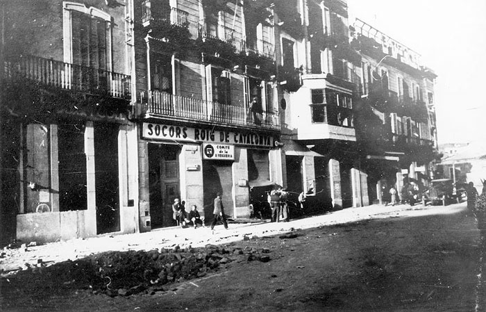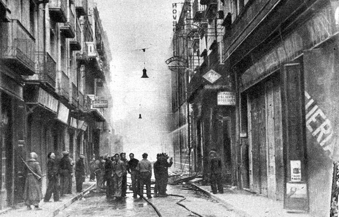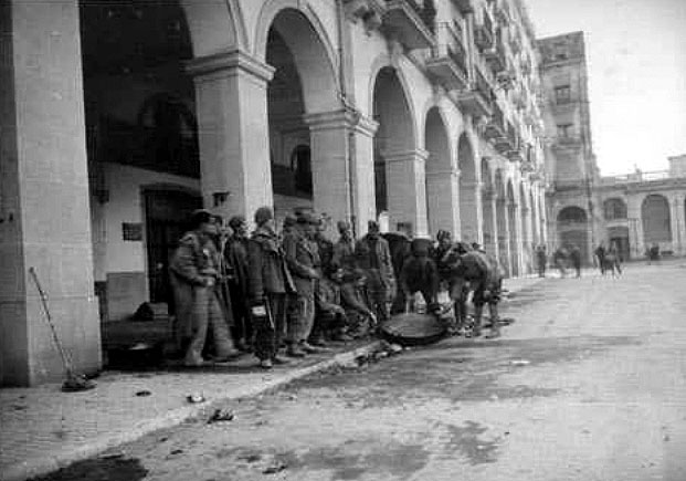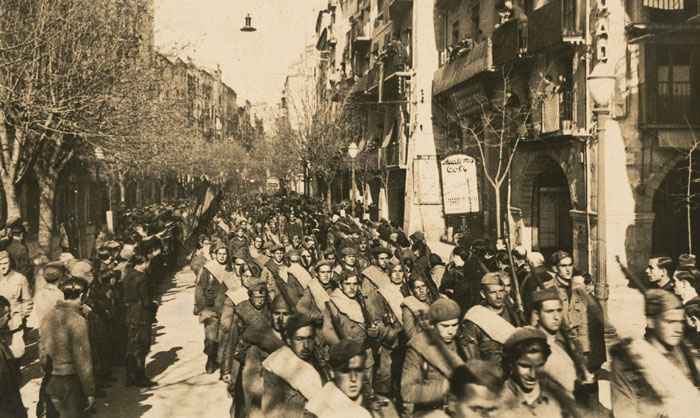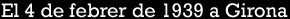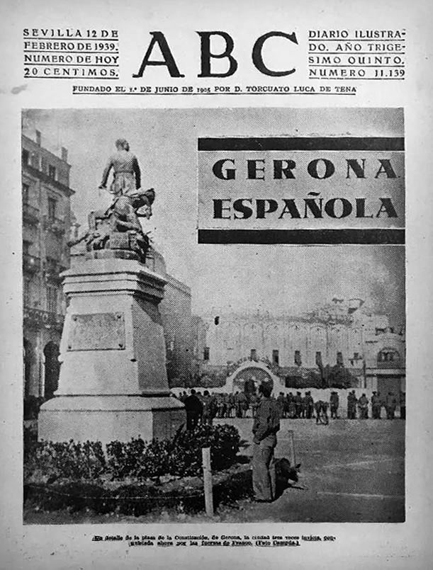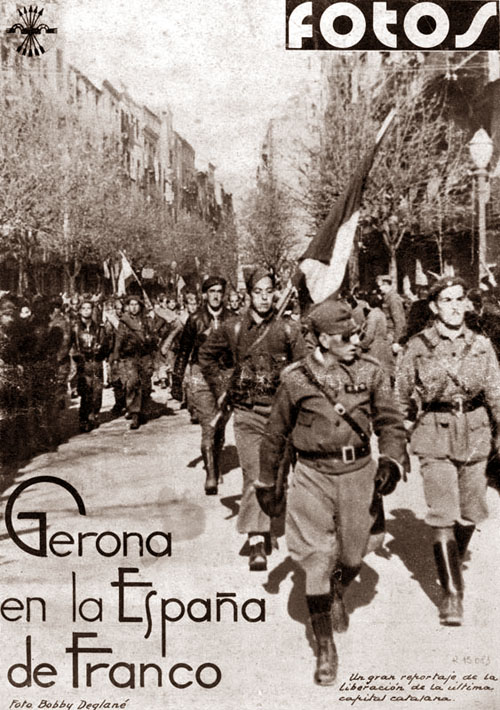 ![]() El 4 de febrer de 1939 s'acabava per la ciutat de Girona la Guerra Civil. Entraven a la ciutat les tropes franquistes de la IV División de Navarra, sota el comandament de Camilo Alonso Vega, i els darrers militars republicans anaven cap a la frontera francesa. L'entrada dels nous dominadors va ser un acte més del passeig militar que els soldats de Franco iniciaren pels volts de Nadal per liquidar la campanya de Catalunya. Sense autoritats en els llocs de comandament, les tropes d'ocupació trobaren la porta pràcticament oberta, però l'espai urbà presentava un aspecte ruinós, castigat per les bombes de l'aviació feixista i els incendis dels republicans que es retiraven cap a l'exili. ![]() (Ampliar) - Tropes franquistes desfilant per la Rambla de Girona, el 4 de febrer del 1939. Autor desconegut. CRDI - Ajuntament de Girona.