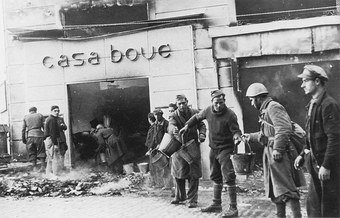 A dos quarts de dues de la tarda, les forces franquistes accediren al barri de l'estació del ferrocarril. Abans de les dues, els combatents entraren per la banda occidental de la ciutat, mentre que els legionaris italians ho varen fer per l'oriental, per la carretera de Sant Feliu de Guíxols i algun escamot per Sant Daniel. ![]() (Ampliar) - Soldats de les tropes franquistes apagant un incendi a la Casa Boué el dia de la seva entrada a la ciutat, el 4 de febrer de 1939. Aquest va ser un dels edificis que s'incendiaren durant la retirada de l'exèrcit republicà. Autor desconegut. Biblioteca Nacional. Els dies previs a l'entrada de les tropes franquistes a Girona, la ciutat va ser bombardejada per la força aèria dels sublevats. Enric Mirambell, cronista oficial de la ciutat de Girona, escrivia al seu article publicat al Diari de Girona de 4/2/2009 que "Girona havia patit en el transcurs d'aquells dos anys alguns bombardeigs aeris, amb les consegüents víctimes humanes i destrosses materials. Però el dia 29 de gener s'inicià una setmana de visites insistents de l'aviació. El diumenge dia 29 patírem el primer bombardeig. [...] Aquella tarda la ciutat va ser atacada des de l'aire en totes les seves barriades. No se'n salvà ni el barri antic. Fins i tot la Catedral va rebre l'impacte d'una bomba. Tot i que les bombes caigudes sobre la ciutat eren de poc calibre feren molt de mal i hi hagué bastants morts i ferits. El pànic s'apoderà de la població. Aquella nit hi hagué calma; però una calma tensa". ![]() (Ampliar) - Destrosses a la plaça del Marquès de Camps, ocasionades probablement pels bombardejos dels dies precedents a l’entrada de l’exèrcit franquista. Ca. 6 de febrer de 1939. Autor desconegut. Biblioteca Nacional. Després dels bombardejos del 27, 28 i 29 de gener, Mirambell explica quin era l'aspecte que presentava Girona el dia 4 de febrer del 1939: "La ciutat fumejava. Des del pont de Pedra veierem la casa Boué incendiada. Soldats i paisans amb galledes intentaven apagar el foc. El carrer Nou presentava un aspecte desolador. La major part de botigues i magatzems havien estat afectats per les bombes o pel saqueig i l'incendi. La fàbrica Gròber també cremava. [...] Molta gent circulava pels carrers. Tots demacrats pel patiment i la llarga temporada de falta d'alimentació. Cares pàl·lides d'aquells que havien estat mesos sense veure el sol i sense que els toqués l'aire. Gent que havia estat amagada. Rostres demacrats per la misèria, cossos que havien perdut una bona part del seu pes normal. Circulaven destacaments de soldats. Alguns moros intentaven o aconseguien entrar en cases on no hi havia els seus estadants, o en botigues. Les patrulles de vigilància procuraven evitar-ho. Per a molts gironins aquell era el dia de l'alliberament; però per a molts altres representava l'inici d'un llarg o potser definitiu exili o bé ser víctimes de la repressió". ![]() (Ampliar) - Soldats de les tropes franquistes al carrer de Santa Clara disposats en cadena per tal de fer arribar l’aigua a la Casa Boué, el 4 de febrer de 1939. Autor desconegut. Biblioteca Nacional. A partir d'aquell dia es repetiren els afusellaments fins el 1945. Se n'han comptabilitzat un total de 514, aplicats, majoritàriament, a elements de les comarques, vinculats al camp o a la indústria. El primer de gener de 1942, seguien reclosos a la presó de Girona 1.683 homes i 580 dones". ![]() (Ampliar) - Incendi al carrer Nou, provocat durant la retirada de l’exèrcit republicà, el 4 de febrer de 1939. Autor desconegut. Revista "Fotos: Seminario gráfico nacionalsindicalista" núm. 103, del 18 de febrer de 1939. Arxiiu municipal de Girona. Joaquim Nadal (op. cit), recull testimonis de persones que s'havien refugiat a la ciutat fugint de l'avanç de les tropes franquistes: "La ciutat-refugi [...] és un formiguer, bull de gent, s'hi apilonen les persones i els embalums que fugen amb elles i que van quedant-se pel camí. És difícil menjar i és difícil dormir. El Teatre Municipal és un immens dormitori". Explica que Antoni Rovira i Virgili va mal dormir dos dies al saló de sessions de l'Ajuntament amb dos bancs ajuntats, i que va ser allà quan va saber, el 25 de gener, que l'alcalde Pere Cerezo havia marxat a França. [...] El 4 de febrer del 1939, la ciutat havia emmudit i l'ambient era de desolació. La ciutat vivia la contradicció dels que començaven l'exili, l'exili interior, o el sacrifici de les seves vides i l'alleujament de molts altres que consideraven que s'havia acabat un malson. La implacable derrota dels uns amb l'ocupació de la ciutat era l'alliberament per als altres". ![]() (Ampliar) - Soldats del Cos de l'Exèrcit de Navarra preparent el ranxo a la plaça de la Independència. Febrer de 1939. CIFRA. Biblioteca Nacional. Un dels fotògrafs que va treballar a Girona en aquella data va ser Bobby Deglané (2), una foto del qual va il·lustrar la portada del número 103 de "Fotos: Seminario gráfico nacionalsindicalista", publicada el 18 de febrer de 1939. Deglané va captar, entre d'altres imatges, el moment en què les tropes franquistes, amb el general Camilo Alonso Vega, cap de la IV Divisió de Navarra, desfilen per la Rambla de la Llibertat a la seva arribada a la ciutat, el 4 de febrer del 1939. ![]() (Ampliar) - Soldats de l'exèrcit franquista i civils a la porta dels Apòstols de la Catedral. Febrer 1939. CIFRA. Biblioteca Nacional. Notes (1) -