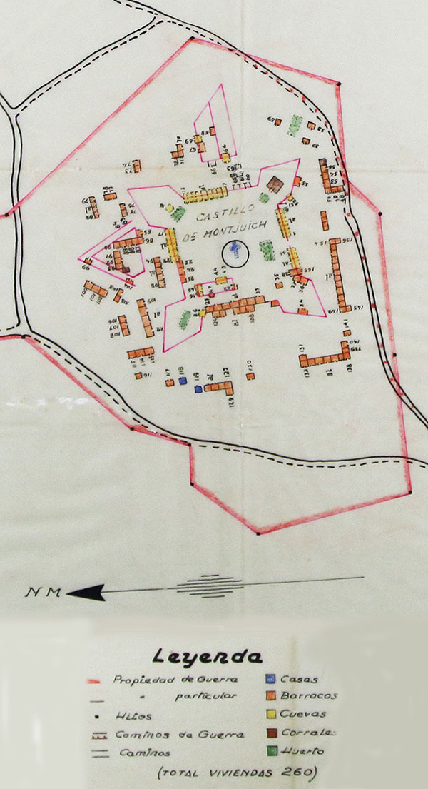 Entre el 1945 i l 1971, el castell i les seves rodalies foren l´assentament d´una població vinguda principalment de les terres d'Andalusia i Extremadura. En aquells moments, el problema de l'habitatge no era pas exclusiu dels immigrants; també per als autòctons hi havia dificultats. Moltes parelles d´acabats de casar havien de conformar-se a viure a la casa paterna, o anar de rellogats. Però aquesta dificultat era molt més acusada per a aquells que no tenien coneixences i que a més no disposaven del necessari per pagar un lloguer, encara que fos mòdic. ![]() (Ampliar) - Barraquisme a la muntanya de Montjuïc. Barraques adossades al mur i a l'interior del castell. 1957. Narcís Sans Prats. CRDI - Ajuntament de Girona.