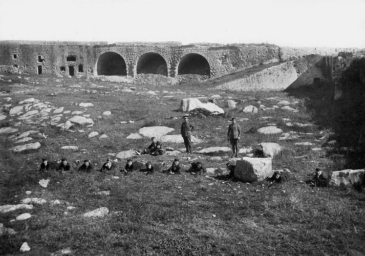 polèmica per la construcció d’aquesta fortificació. El motiu era que, segons Rinaldi, es deixava massa espai sense cobrir a la muntanya de la Barrufa, i això permetia que un hipotètic exèrcit enemic pogués assentar-se-hi i assetjar la fortificació. El marquès de Buscayolo, en canvi, al·legava que havia hagut d’aprofitar la construcció prèvia i, per aquest motiu, s'havia construït on actualment estava. ![]() (Ampliar) - Grup de soldats que fan el servei militar a Girona durant uns exercicis de tir al castell de Montjuïc. 1923. Autor desconegut. CRDI - Ajuntament de Girona.