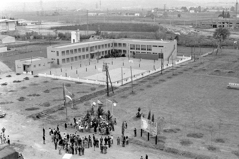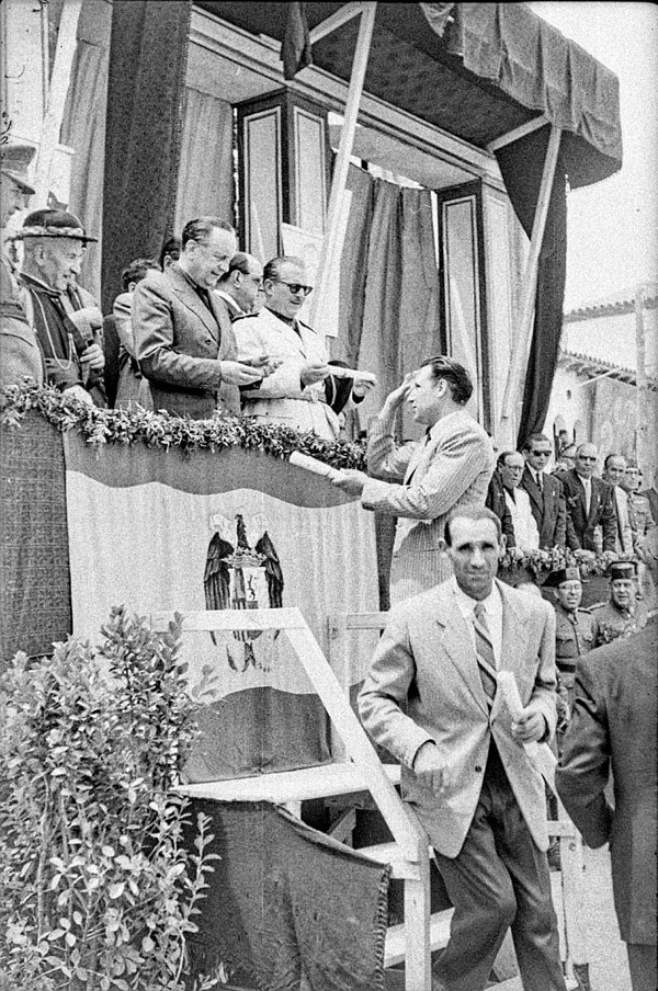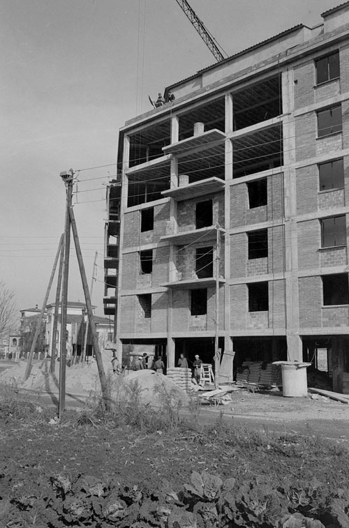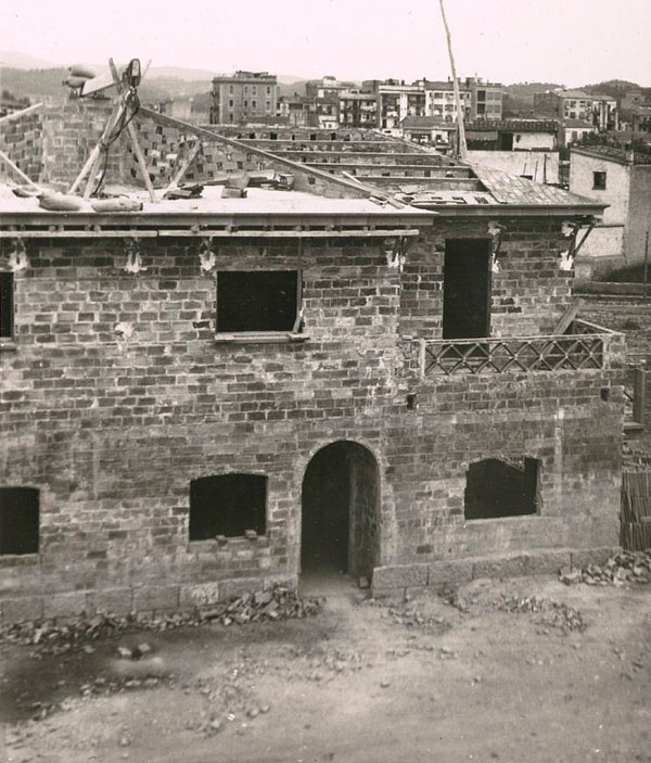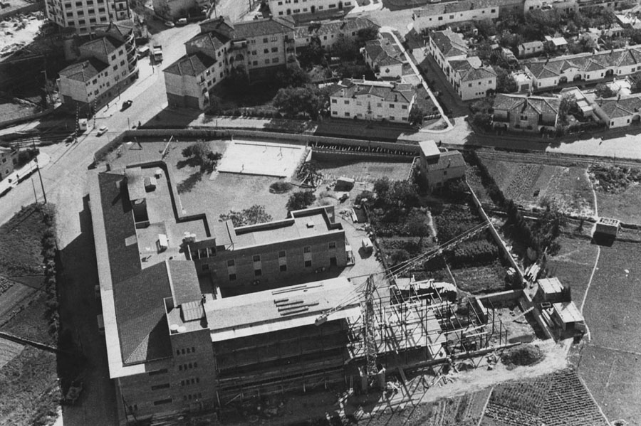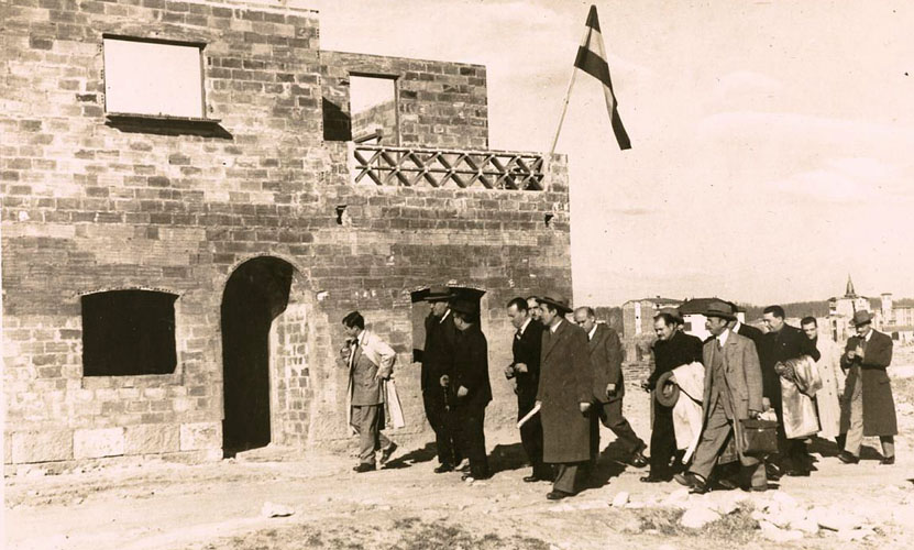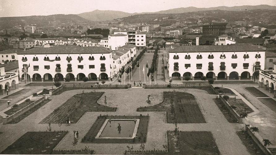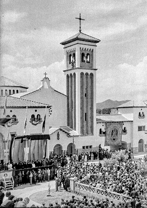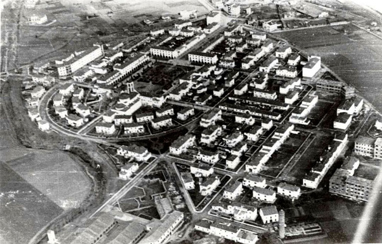 Després de les inundacions de 1940 es començà a pensar en la necessitat de construir el barri (1). El conjunt es va edificar sobre terrenys expropiats a dotze propietaris. L'octubre de 1942, es va fer un avantprojecte que preveia ocupar 251.436 m2, on hi hauria 507 habitatges, església i centre parroquial, “hogar del productor”, col·:legi, camp d'esports, clínica-sanatori i un viaducte o pas elevat per travessar les vies del ferrocarril de Madrid-França i Sant Feliu de Guíxols-Girona. ![]() (Ampliar) - Inauguració oficial del Grup Sant Narcís. Les autoritats a l'acte amb el bisbe, Josep Cartanyà. 2 de juny de 1952. Martí Massafont Costals. CRDI - Ajuntament de Girona. El projecte era dissenyat el 1944, sota les directrius de la "Ley de Casas baratas", però les obres no s'iniciaren fins el 1948, degut a les dificultats en el procés apropiatiu. L'any 1951 es lliuraren les primeres cases, després d'una subhasta deserta. La construcció es realitzà per administració directa amb formació d'equips de treballadors. El barri s'inaugurà el 18 de juliol de 1951, però la inauguració oficial no es realitzaria fins el febrer de 1952. El barri constaria finalment de 527 habitatges, església, centre social, centre parroquial i escola de formació professional. ![]() (Ampliar) - Vista aèria del barri de Sant Narcís. En primer terme, la construcció del col·legi de les Dominiques. Al centre, les vies de la línia del carrilet d'Olot, que serien retirades el 1969. A l'altre costat, habitatges del barri. 1960. AUtor desconegut. CRDI - Ajuntament de Girona. L'estructura inicial del barri. ![]() (Ampliar) - Inauguració oficial del Grup Sant Narcís. Veïns a la plaça de l'Assumpció. 2 de juny de 1952. Martí Massafont Costals. CRDI - Ajuntament de Girona.