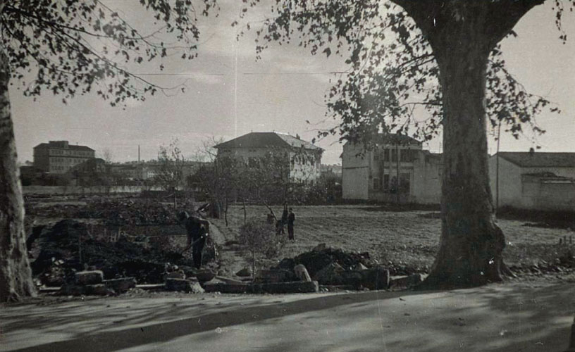 ![]() Sant Narcís abans de Sant Narcís. ![]() (Ampliar) - Estany de la plaça de l'Assumpció. Aquest notable edifici, la torre del qual és datada entorn al segle XVI, i actualment institut d'ensenyament, s'hauria assentat damunt un poblat o necròpolis hallstàttiques. Durant unes excavacions, realitzades l'any 1941, van aparèixer restes de ceràmica de l'època a sota la casa, i també interessants vestigis l'època romana. Ente 1876 i 1877 es van descobrir, a l'anomenada masia de Can Pau Birol, uns mosaics de la primera meitat del segle III que provaven clarament que en aquest indret hi havia hagut una important vila suburbana romana. ![]() (Ampliar) - Obres de construcció del porticat de la plaça de l'Assumpció. 26 de desembre de 1949. Autor desconegut. CRDI - Ajuntament de Girona. L'origen de l'actual barri. ![]() (Ampliar) - Vista aèria del barri de Sant Narcís. A l'esquerra, el riu Güell. 1952-1975. AUtor desconegut. CRDI - Ajuntament de Girona. Al seu voltant es desenvolupen els carrers que contenen edificacions unifamiliars aïllades i aparellades i edificades en dues plantes i amb jardí independent. També hi ha alguns blocs de quatre plantes, construïts en una segona fase. Les cases presenten una estructura de parets de càrrega, amb sostres de voltes de quatre punts. L'exterior és arrebossat i pintat i la coberta bàsicament de teula àrab. El traçat geomètric del conjunt és ben definit i autònom respecte la resta de la ciutat. ![]() (Ampliar) - Visita de les autoritats en el primer any de construcció dels habitatges del Grup Sant Narcís. 16 d'octubre 1949. Narcís Grosset Oliver. CRDI - Ajuntament de Girona.