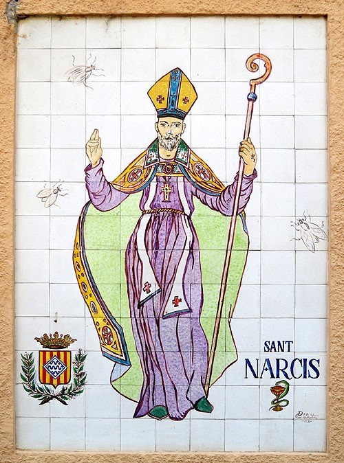 A la façana hi destaca una figura de Sant Narcís. Aquesta terra cuita industrial, procedent de Ceràmiques Marcó de Quart. Amb la mà dreta, el sant està beneint mentre que amb la mà esquerra sosté un llibre. Explica la llegenda que sant Narcís va ser bisbe de Girona durant la seva estada a la ciutat. ![]() (Ampliar) - Peces de ceràmiques Marcó de Quart, un element típic del barri de Sant Narcís. ![]() (Ampliar) - Acte de col·locació de la primera pedra del complex esportiu del GEiEG de Sant Narcís. A l'esquerra, l'escola Mare de Déu del Mont. 4 de novembre de 1973. Juli Torres Monsó. CRDI - Ajuntament de Girona. ![]() (Ampliar) - Vista aèria del barri de Sant Narcís. 1980-2000. Jordi S. Carrera. CRDI - Ajuntament de Girona. ![]() (Ampliar) - Instal·lacions de la Camps. Ca. 1950. Narcís Sans Prats. CRDI - Ajuntament de Girona. ![]() (Ampliar) - Edifici de la Delegación Provincial de Sindicatos Hogar del Productor "San Narciso". Ca. 1970. Joaquim Curbet. CRDI - Ajuntament de Girona. ![]() (Ampliar) - Barri de Sant Narcís. 2012. Joan Sabater Brunet. CRDI - Ajuntament de Girona. Notes