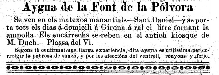 (1) - L'U d'octubre de 1928, el suplement literari de 'L'Autonomista', publicava un article on informava que "Més que per l'aigua medicinal, els manantials són aprofotats per a l'obtenció d'àcid carbònic natural que han fet e Girona el primer centre productor d'Espanya i un dels més importants del món".