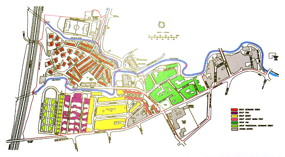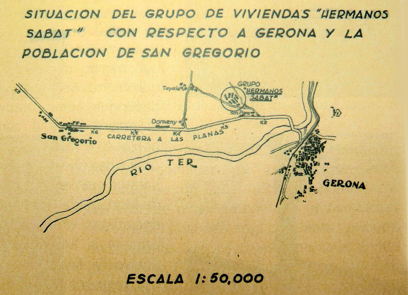 L'edificació d'aquell nucli inicial va ser seguit pels polígons Kim, Benet, Fina, els grups d’habitatges Josep Maria Prat i Sant Gregori i les urbanitzacions posteriors de Torres de Taialà i Mas Catofa. ![]() (Ampliar) - Plà:nol de situació del grup Germans Sàbat respecte de la Girona dels anys seixanta del segle XX. Arxiu Històric de Girona