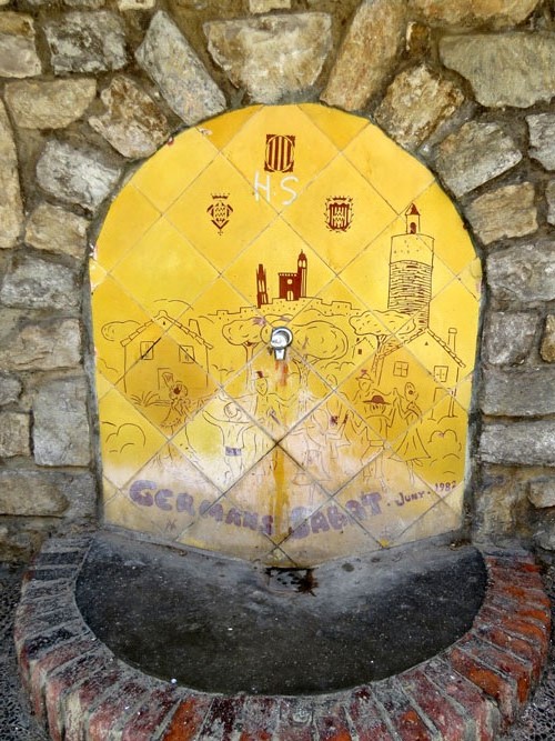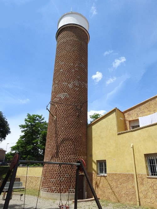 Un element curiós del barri és un pont de ferro, sobre la riera Bullidors, construït per l'empresa Eiffel, pont que inicialment estava situat sobre el riu Güell, pels voltants de l’any 1876, a continuació de la ronda Ferran Puig, fins a l’any 1906, en que fou substituït per un de pedra. ![]() (Ampliar) - Sales de la biblioteca de Germans Sàbat. 1960-1970. Narcís Sans Prat. CRDI - Ajuntament de Girona Un símbol molt identificatiu del barri és la torre de l'aigua. coneguda com el pou, una imponent torre circular de 20,65 metres d'alçada i 3 metres de diàmetre, construïda de maó, que subministrava, des de 1958, d'aigua extreta d'un aqüífer subterrani situat a 18 metres de profunditat, i que durant la dècada dels anys setanta s'aprofundí fins als 40 metres. A la part més alta, un dipòsit de 8.000 m3 alimentava fins a un total de 270 preses d'aigua, les cases del Grup i els pisos de la plaça amb els seus corresponents locals. ![]() (Ampliar) - Inauguració: de les anomenades microescuelas al barri de Germans Sàbat. 18 de desembre de 1960. Narcís Sans Prat. CRDI - Ajuntament de Girona