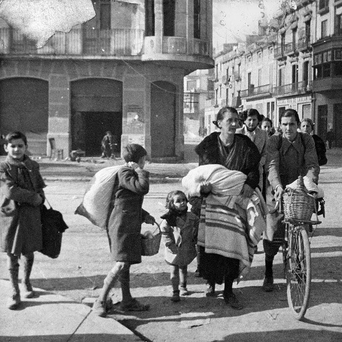 A finals de gener i primers dies de febrer de 1939, una gernació que fugia cap a l’exili feien parada a Girona. Davant la imminència de l'entrada de les tropes franquistes, l’alcalde Pere Cerezo va abandonar la ciutat i va marxar a l’altra banda de la frontera. ![]() Enttrada de les tropes franquistes a la ciutat de Girona. Actual Rambla de la Llibertat. 4 de febrer 1939. Autor desconegut. CRDI - Ajuntament de Girona.