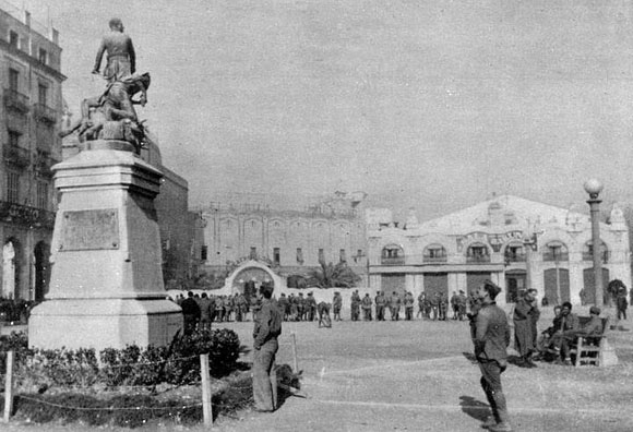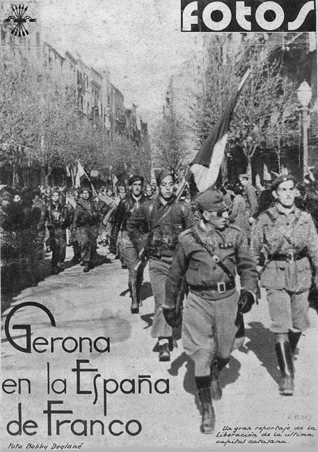 La caiguda de Girona en poder de les tropes nacionals va ser celebrada pel Gran Consell del Feixisme, el qual va fer una declaració entusiasta en què saludava els vencedors i assegurava que el feixisme “no habrá de descansar hasta que los Ejércitos de Franco hayan totalmente vencido al enemigo”. ![]() Soldats a la plaça de la Independència, pocs dies després de l’entrada de les tropes franquistes a la ciutat. S’observa encara el cartell de Sala Bakunin a les parets del cinema Coliseo. Revista "Fotos. Seminario gráfico nacionalsindicalista", núm. 103, 18 de febrer de 1939. Arxiu Municipal - Ajuntament de Girona.