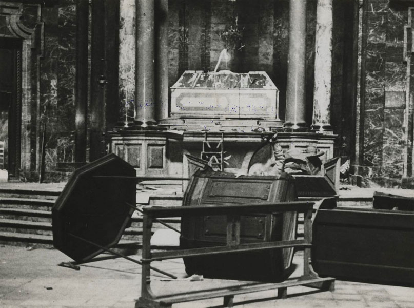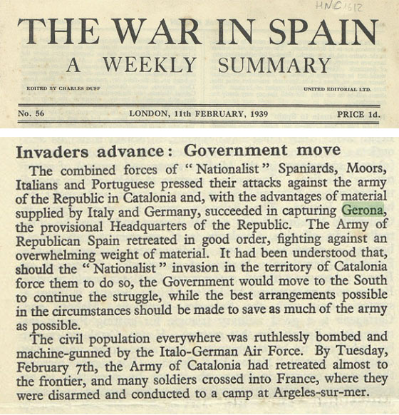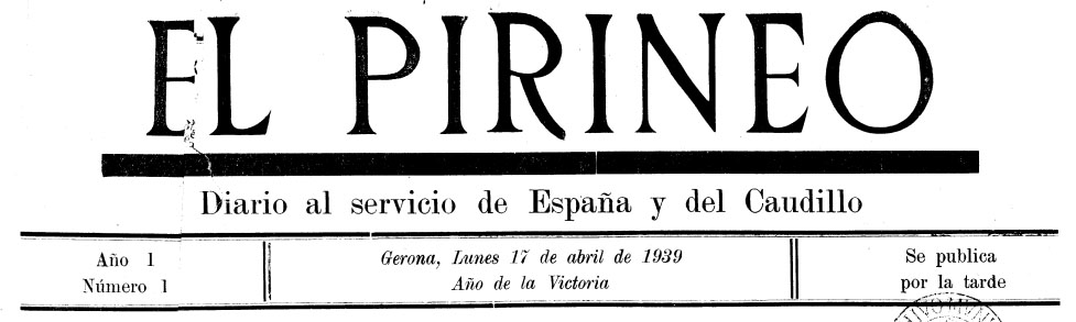 reinstauració de la Diputació, el dia 7 de febrer, fou ordenada pel tinent auditor Tomás Garicano Goñi, més tard ministre de la Governació, i la presidència va ser conferida a l’advocat olotí Martirià Llosas. ![]() El camp de la bota. A l'esquerra, la paret del cementiri de Girona. 1939. Fotografia Salvador Crescenti Miró. CRDI - Ajuntament de Girona. ![]() Capella ardent establerta a l'església de Sant Pere de Galligants, que acollí el centenar de fèretres de les víctimes de la Guerra Civil morts, majoritàriament, pels Comitès Antifeixistes de Salt i Orriols. Els cossos reberen una missa d'homenatge a la Catedral, en un acte organitzat per la Hermandad de Cautivos de España, i el mateix dia a la tarda foren traslladats al cementiri de la ciutat. En la notícia apareguda al diari El Pirineo el 28/4/1939, figura la llista amb el nom de les víctimes encapçalada pel titular: A la memoria de los Mártires, por Dios y por España, sacrificados por la tiranía roja. 18 d'abril 1939. Foto Lux. CRDI - Ajuntament de Girona. ![]() Capçalera del primer número de "El Pirineo", publicat el 17 d'abril de 1939. SGDAP - Ajuntament de Girona. Notes (1) - Josep Clara, "Tres dates clau de la Guerra Civil a Girona", a "Segona República i Guerra Civil a Girona (1931-1939)". Conferències a l'Arxiu Municipal de Girona. ISBN: 84-8496-025-0. 2006, Ajuntament de Girona. Tornar al text(2) - L'església de Sant Feliu, també va ser assaltada, cremant-hi algunes coses, però es pogué evitar que es destruís el sepulcre de Sant Narcís, el qual fou traslladat a la biblioteca municipal, a l'actual Rambla de la Llibertat, on fou exposat al públic posteriorment. (3) - Els militars que intentaren de fugir van ser capturats a l’Escala o a Barcelona. En un primer moment foren reclosos al convent de les Adoratrius, habilitat com a presó, i després foren traslladats a Barcelona, al vaixell "Uruguay", on romangueren fins que, el mes d’octubre, hagueren de comparèixer davant el tribunal popular que sancionà la seva conducta. (4) - “Durant la setmana del 3 al 10 de maig corrent, es produïren arreu de Catalunya i al mateix temps a la nostra ciutat, uns fets lamentables i dolorosos, els quals sense voler entrar a analitzar-los, mereixen ésser condemnats per tots el republicans, demòcrates i antifeixistes. (5) - Les víctimes d'aquell bombardeig foren: Joaquima Roura Plana; Maria Verdaguer i Masó; Francesc Lladó i Camajoan (d'11 anys); Margarida Mir i Boada (de 26 anys); Ramon Comalada i Sala (de 9 anys); Joan Jordà i Jordà. (6) - El comunicat oficial corresponent al 4 de febrer deia: “Nuestras tropas han rodeado en el día de hoy Gerona, que ha sido totalmente ocupada y rebasada. La población aparece casi destruida en su parte oeste por las voladuras e incendios que los rojos han realizado antes de huir. La población civil fue, en gran parte, obligada a evacuarse con toda clase de violencias. Los habitantes que han quedado cuentan verdaderos horrores de los crímenes y saqueos cometidos por los rojos. Nuestras tropas han sofocado numerosos incendios, evitando las voladuras del resto de la ciudad, que los rojos estaban llevando a cabo al llegar nuestras fuerzas". Bibliografia |