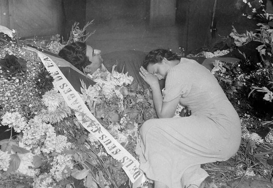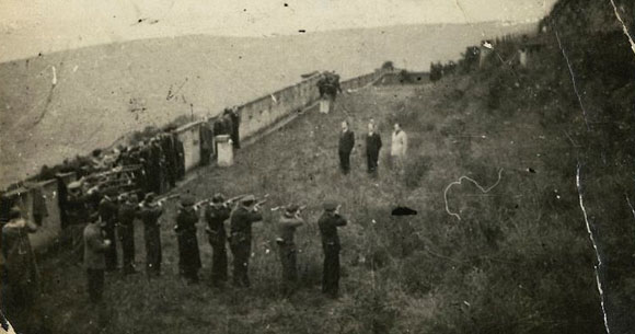 La primera víctima mortal dels aldarulls es va produir el 20 de juliol: Pere Coma Ysern, conegut com a Pere Jan, un dels carlins que havien sortit al carrer el dia de l’aixecament, va ser atrinxerat per la guàrdia d'assalt de la República. ![]() Capella ardent de Dídac Tarradell, membre del POUM i company d'Antònia Adroher, mort a causa d'un tiroteig entre el Comitè del Front Antifeixista i un grup carlista. 25 de juliol 1936. Foto Lux, CRDI - Ajuntament de Girona. ![]() Pelotó d'afusellament dels militars Felicià Montero i Dalmases, Joaquin Ruiz de Porras i Josep Borbon i Rich al castell de Sant Julià de Ramis. 13 d'octubre 1936. CRDI - Ajuntament de Girona.