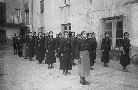 Els objectius varen ser assolits sense lluita ni sang, però va ser una victòria efímera. Abans d'acabar el dia, les paraules de rendició del general Manuel Goded a Barcelona significaren el fracàs del moviment facciós a Catalunya, i el responsable de la comandància militar de Girona, el general Jacinto Fernández Ampón, ordenà l'immediat replegament de les tropes a les casernes. També s’havia fet enrere la Guàrdia Civil, el comandant de la qual va escapar-se cap a la frontera amb el cotxe oficial (1). ![]() Formació de milicianes del POUM en el pati interior del convent de les Beates. 1937. Foto Lux. CRDI - Ajuntament de Girona.