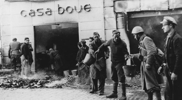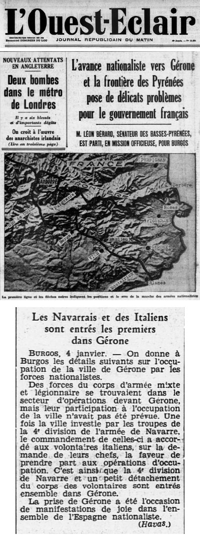 L’ocupació militar franquista va ser una continuació del passeig triomfal que els nacionals havien iniciat a les vigílies de Nadal per acabar la campanya de Catalunya (6). ![]() Soldats nacionals sufocant un incendi a la casa Boué de Girona, a tocar el Pont de Pedra, el 4 de febrer 1939. Foto: Biblioteca Nacional.