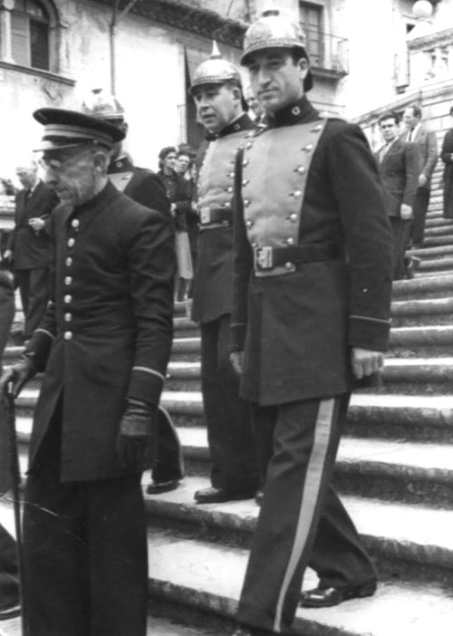 (Ampliar) - Inauguració del 'Hogar Infantil Nuestra Señora de la Misericordia'. Agents amb uniforme de gala a l'entrada del centre. 21 d'abril de 1963. Salvador Crescenti Miró. CRDI - Ajuntament de Girona. L'arribada dels Ajuntaments democràtics.