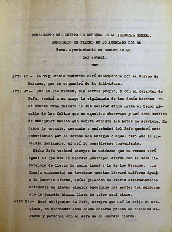 (Ampliar) - Reglament del cos de serenos de la ciutat de Girona. 1926. Arxiu Municipal de Girona.