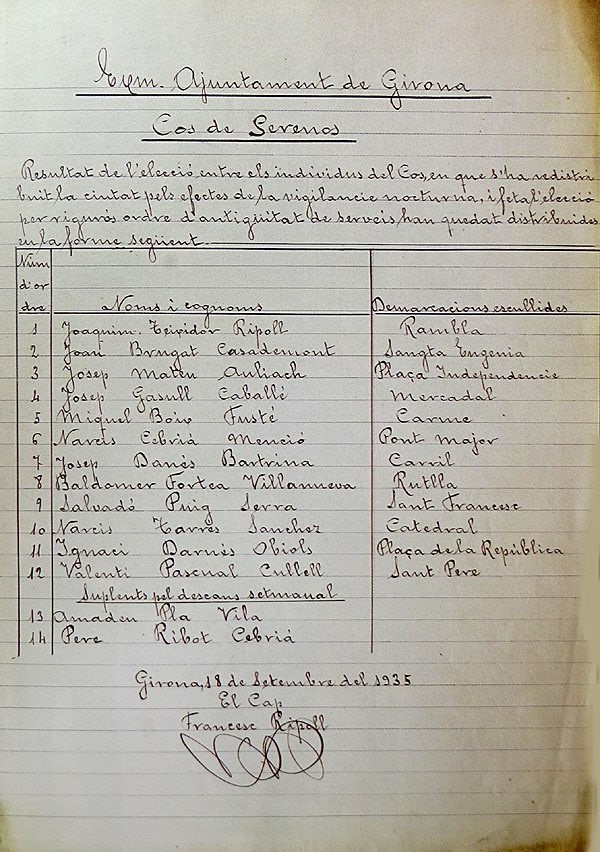(Ampliar) - Distribució dels guàrdies nocturns en les dotze demarcacions de Girona. 1935. Arxiu Municipal de Girona.